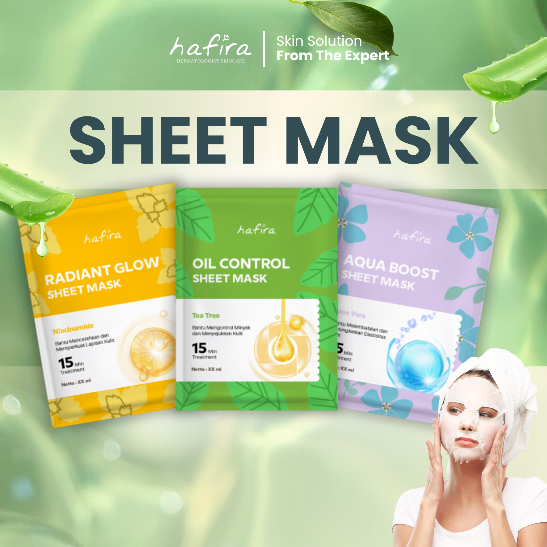 Untuk perawatan ekstra, gunakan masker wajah dua hingga tiga kali seminggu. Gunakan Sheet Mask by Hafira Skincare : Oil Control Sheet Mask untuk kulit berminyak dan cenderung berjerawat, Aqua Boost Sheet Mask untuk Extra Hidration, Radiant Glow Sheet Mask untuk mencerahkan sekaligus meratakan warna kulit kalian.